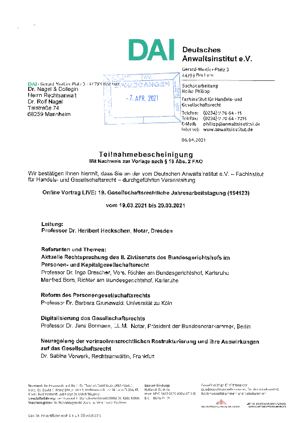 • Ausgewählte Probleme des Personen- und Kapitalgesellschaftsrechts (März 2021)